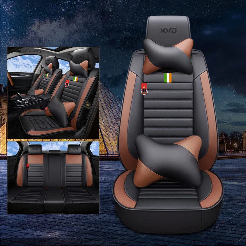 KVD Superior Leather Luxury Car Seat Cover For Tata Curvv Black + Tan Free Pillows And Neckrest Set (With 5 Year Onsite Warranty) - D101/77