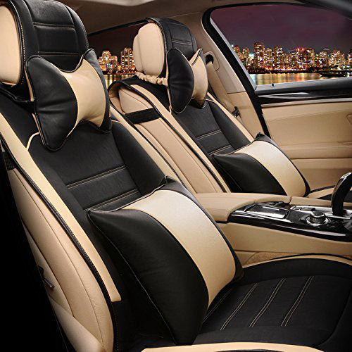 KVD Superior Leather Luxury Car Seat Cover For Kia Syros Black + Beige Free Pillows And Neckrest Set (With 5 Year Onsite Warranty) - D120/158