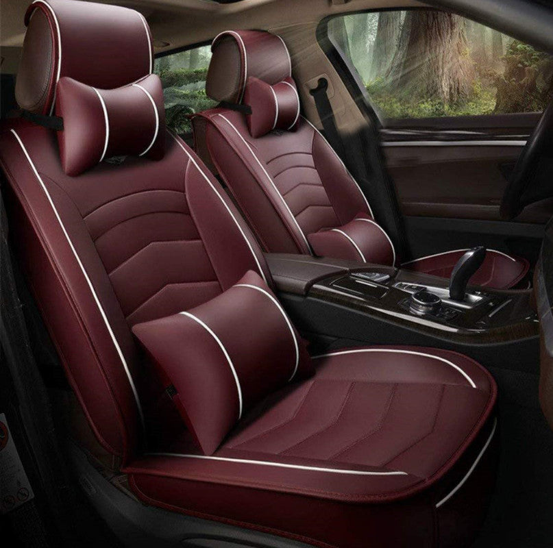 KVD Superior Leather Luxury Car Seat Cover For Kia Syros Wine Red + White Free Pillows And Neckrest Set (With 5 Year Onsite Warranty) - DZ106/158