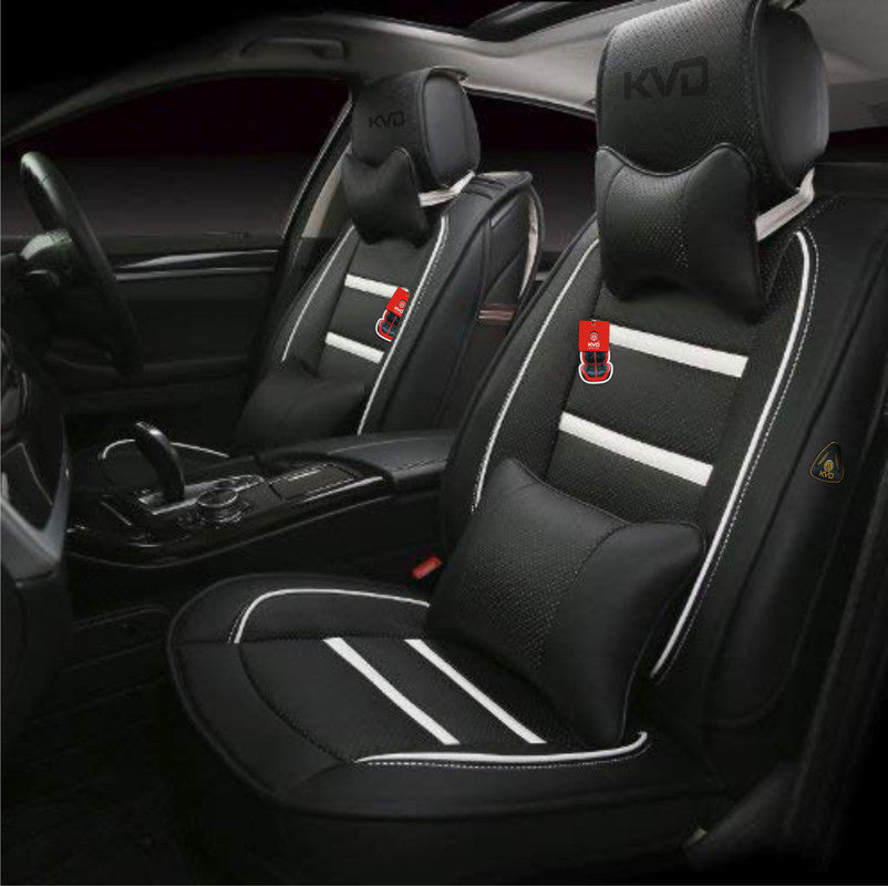 KVD Superior Leather Luxury Car Seat Cover For Tata Curvv Black + Silver Free Pillows And Neckrest Set (With 5 Year Onsite Warranty) - D117/77